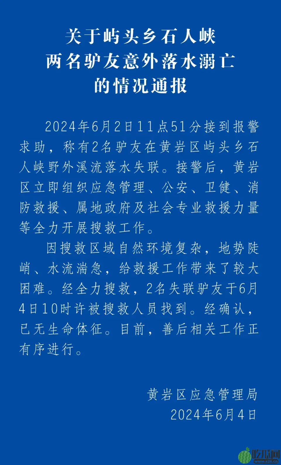 6月2日11时51分接到报警求助,有2名驴友在浙江台州黄岩区屿头乡石人峡野外溪流落水失联。接警后,黄岩区组织应急管理、公安、卫健、消防救援、属地政府及社会专业救援力量等全力开展搜救工作。文章源自吃瓜网https://www.hanshushu.com/吃瓜网-https://www.hanshushu.com/100068.html
